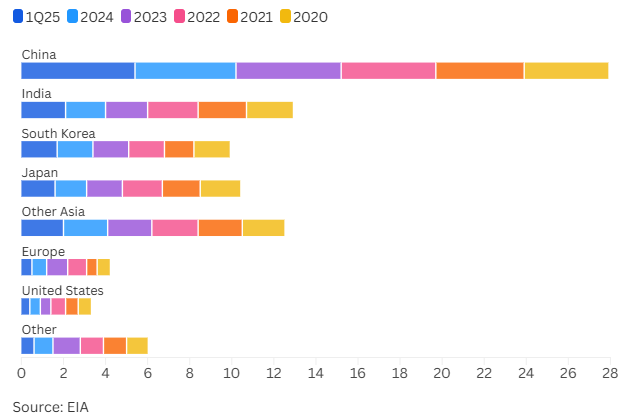 Untuk LNG, paparan mereka terhadap Teluk lebih rendah daripada Asia Selatan. Korea Selatan memasok 14% LNG-nya dari Qatar dan UEA, sementara Jepang memasok 6%, menurut perkiraan Kpler.